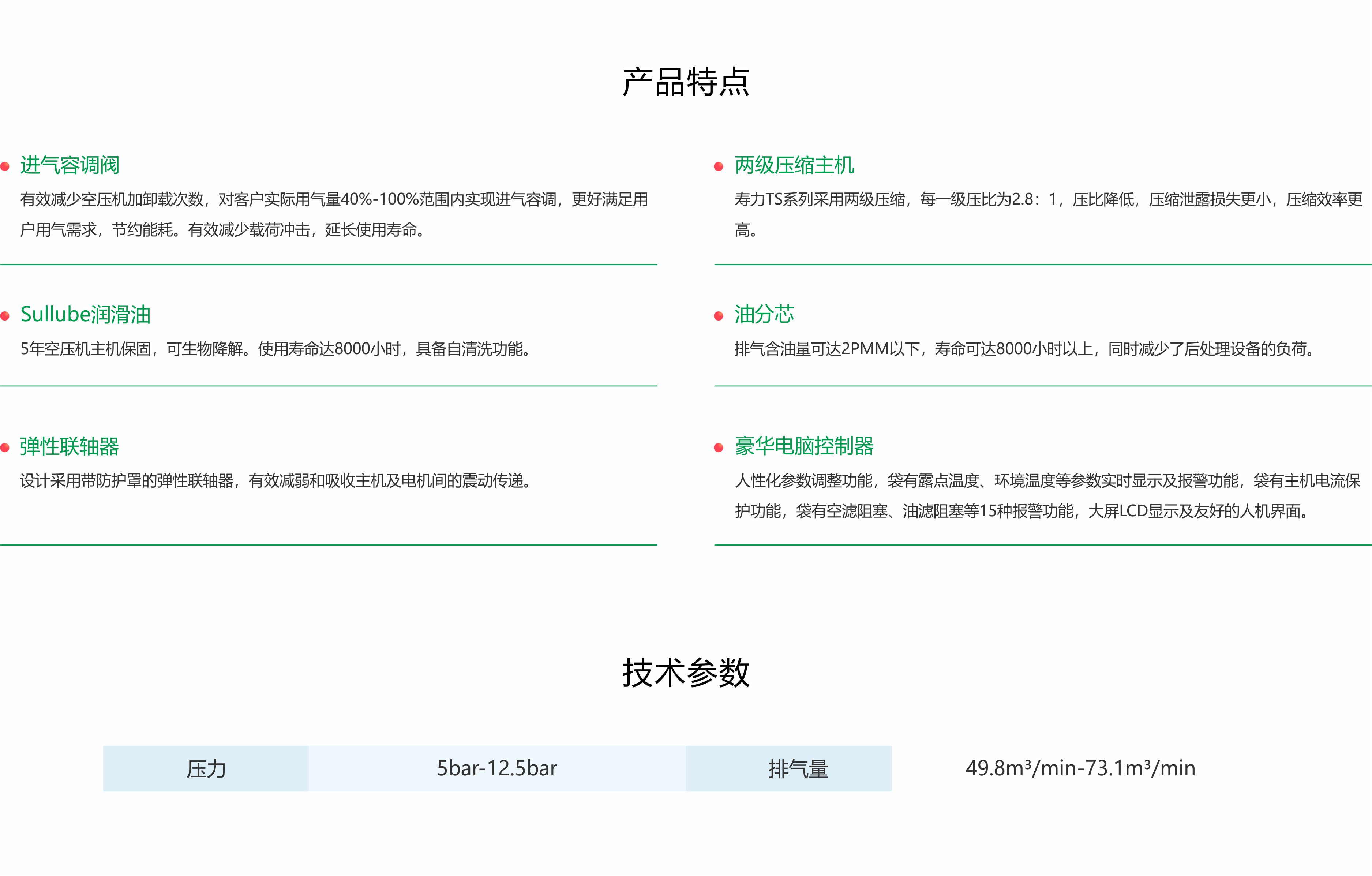 TS315-355系列固定式螺杆空气压缩机是美国寿力亚洲公司根据市场需求,在TS32S-400/450的基础上开发的一款产品。该产品具有排气量大、能效好和噪声低等特点,它采用整体箱式结构,优化的进风道设计,全系使用美国原装双级变容主机等零部件,增加了内置热回收及内置变频器选项。同时更加注重人性化设计,提供了宽敞的工作和维护空间,方便了广大用户的使用和管理