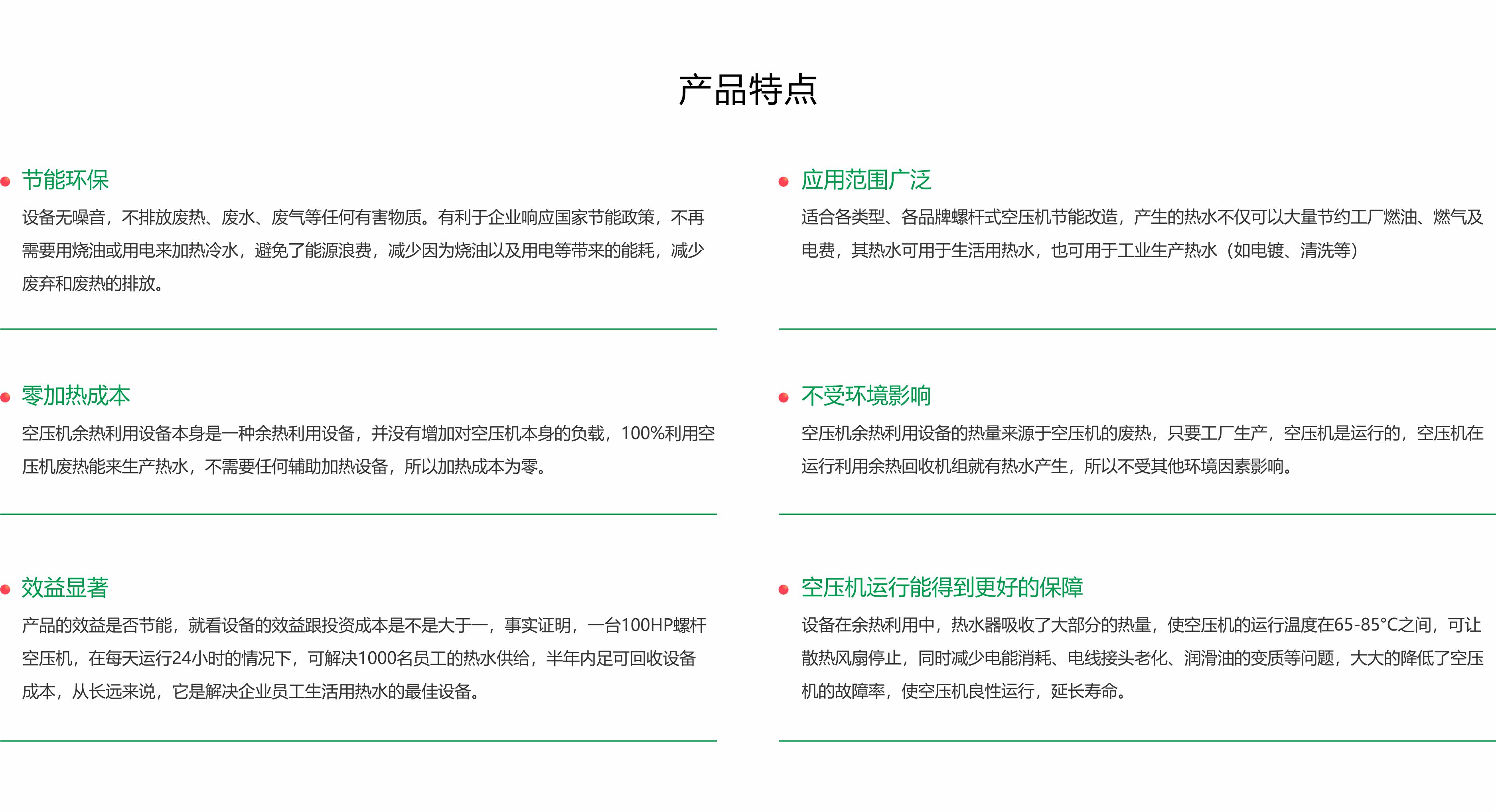 空气压缩机应用广泛,在长期、连续的运行过程中,根据能量守恒原理把电能转换为机械能和热能。空压机在工作时产生大量热能,最后以风冷或水冷的形式把废热能浪费到环境中。空气压缩机产生热能,不仅运营成本高,而且环境污染极为严重,如将该部分热能回收利用于企业生活取暖、工业用水、热水空调等等运用中,必将为企业消减大量热水投资成本,更有可能成为企业利润中心之一。