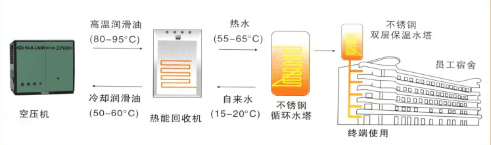空气压缩机产生热能,不仅运营成本高,而且环境污染极为严重,如将该部分热能回收利用于企业生活取暖、工业用水、热水空调等等运用中,必将为企业消减大量热水投资成本,更有可能成为企业利润中心之一。