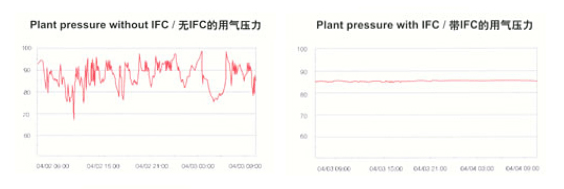 智能流量控制器IFC(Intellgent Flow Control)安装于用气单位得管道入口前,通过恒压供气(±1PSI)来精确、灵敏地控制压缩空气流量得输送,消除压力浪费来减少流量消耗,减少空压机产期做工实现节能,并优化生产工艺提高生产质量。